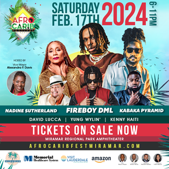 Miramar, Florida’s 4th Annual Afro-Carib Festival (ACF) features a headlining performance by “Peru” Nigerian afro beats sensation Fireboy DML and additional performances by Grammy Award-winning reggae artist Kabaka Pyramid, old school dancehall hitmaker Nadine Sutherland, David Lucca, Yung Wylin’, and Kenny Haiti. In addition to live music performances, festival goers will enjoy specialty Caribbean and African dishes and unique merchandise representing the many cultures of the Diaspora. ACF is happening on Saturday, February 17 at 6 p.m. inside the Miramar Regional Park Amphitheater at 16801 Miramar Parkway. For more Afro-Carib Festival information, please visit www.afrocaribfestmiramar.com or call 954-602-3178.